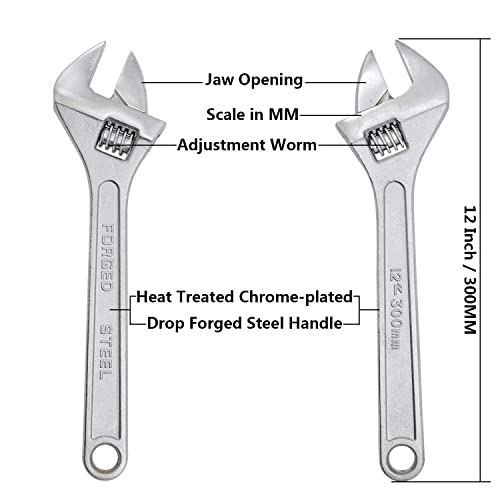 Home DIY & Tools 6 8 10 12 Inch Silver Adjustable Wrench, 20-40 mm Wide Jaw Opening, Drop Forged Steel Heat Treated Chrome-plated, Professional Garage DIY Classic Proto Tools (12 Inch)