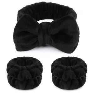 WSYUB Makeup Headbands, 1pcs Black Spa Headband Fluffy Bow Tie Headband Microfiber Face Headband, and 2Pcs Wrist Spa Wash Band Absorbent Wristbands, for Washing Face Skin Care