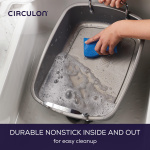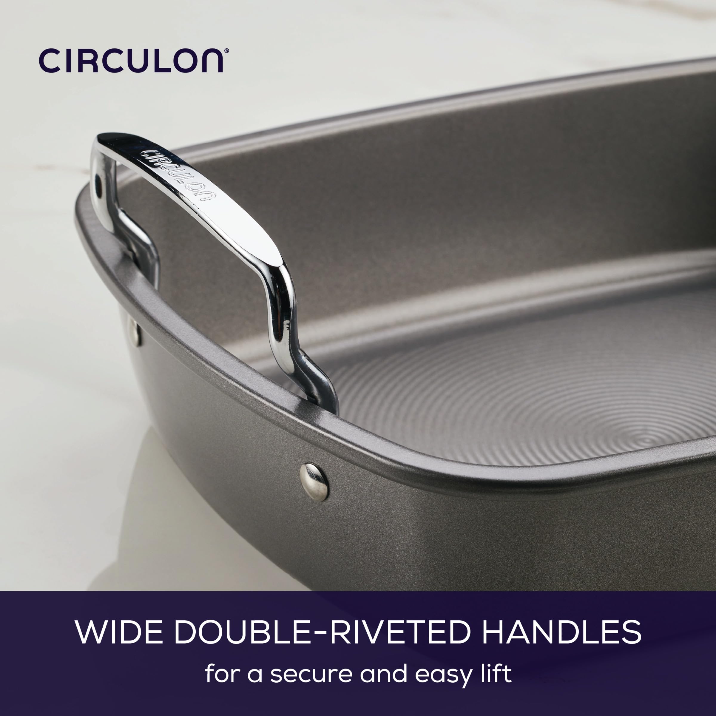 Details: The Circulon Nonstick Bakeware 17 inch by 13 inch Roaster with U-Rack makes it simple to create holiday roasts, family feasts, and more. With its convenient chrome-plated U-shaped rack, this oven roaster keeps meats off the bottom of the pan so unwanted fats drip away to the bottom of the roaster. The heavy-duty steel construction promotes balanced heat distribution for superior cooking performance and long-lasting durability while the nonstick roaster has rolled edges for extra strength. The oven roaster also features premium-quality nonstick for excellent food release and easy cleanup. Oven safe to 450 degree Fahrenheit, this big turkey roaster is a great way to create delicious meals. Roasting turkey, ham, roast beef, chicken and more is easier using the Circulon Bakeware 17 inch by 13 inch Nonstick Roaster with Rack.