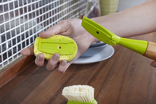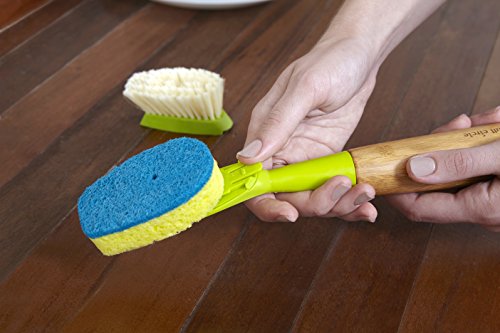 Details: Talk about one awesome duo! A bamboo handle plus a replaceable head with tough-scrubbing bristles make dish duty fly by in a flash. And when you’re done, stand it up for fast, easy drying.