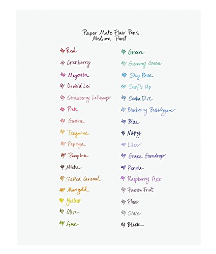 Details: Fact: dull, smudgy ink is a downer. So boost your writing fun-factor with Paper Mate Flair Felt Tip Pens! With a rainbow of bright colors and smear-resistant ink that won’t bleed through the page, these colored pens make writing a blast. The medium point (0. 7mm) writes in bold, colorful lines so your self-expression makes a major statement. The best part of all? Everything you can create—whether you’re taking notes, drawing, doodling, or doing anything else that inspires you. With Flair Pens, there’s no limit to your fun.