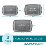 Details: Offering three popular-sized nonstick baking pans, the Rachael Ray(r) Bakeware 3-Piece Nonstick Cookie Pan Set is ideal for making both savory and sweet treats. These cookie pans are made from durable steel that resists warping and feature long-lasting nonstick that provides excellent food release and easy cleanup. With a small, medium, and large cookie sheet, enjoy the convenience of three sizes to do everything from using the set as roasting pans, broiling cheesy garlic bread, or baking Rachael’s Ranch-Style Potato Skins and yummy Kahlua Chocolate Chunk Cookies. The nonstick baking pans feature bold-colored, extra-wide grippy handles that provide a confident grasp when pulling items from the oven and are oven safe to 500°F. These versatile cookie pans are the perfect complement to many other pieces in Rachael’s bakeware and cookware collections that always spell fun in the kitchen. Hit a triple play with the Rachael Ray Bakeware 3-Piece Nonstick Cookie Pan Set that includes three durable baking pans for creating delish baked foods.