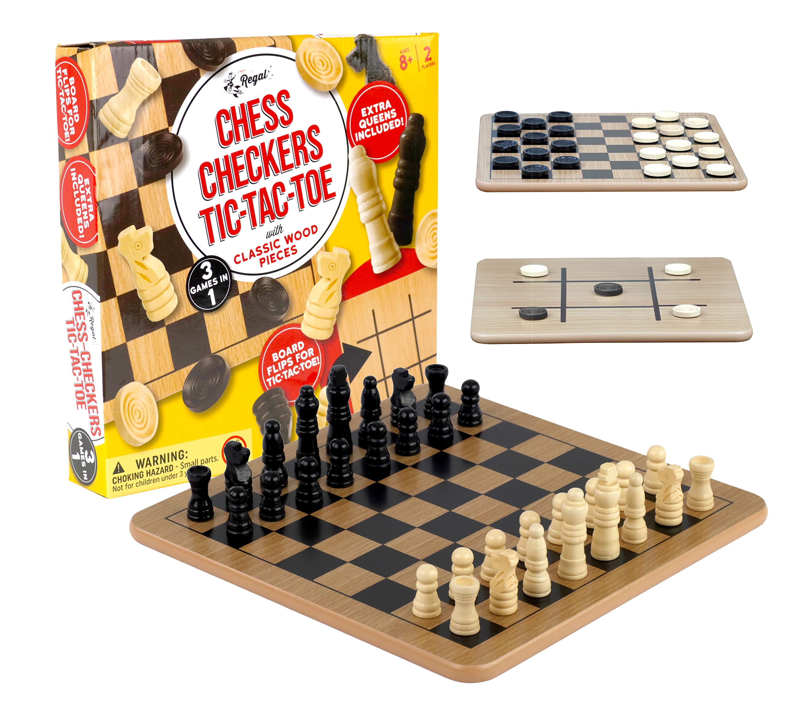 • VERSATILE SET: The Regal Games Wooden Checkers, Chess, and Tic-Tac-Toe Reversible Board Game comes with everything you need to have a good time with family and friends, including a 10.5 ” x 10.5 ” wooden board that can be used as a checkerboard, chessboard, or tic-tac-toe board and comes with 24 interlocking wooden checkers and 32 chess pieces.