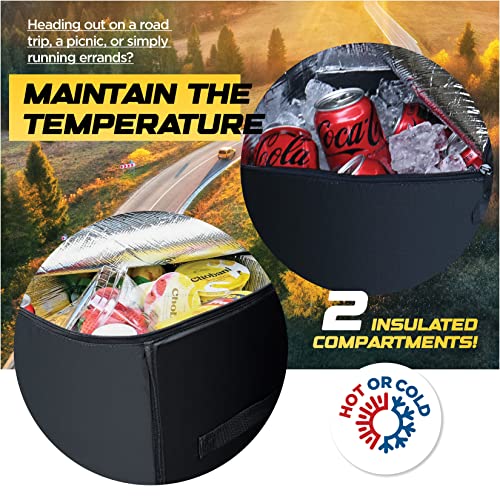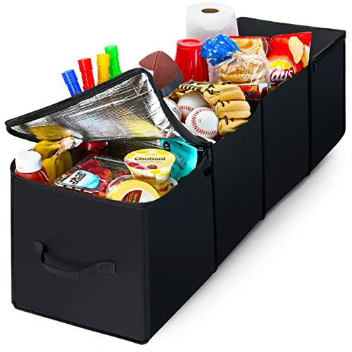 Details: ★ Customized design fits in the Trunk of Most Vehicles. Measuring 46” x 12” x 12” Inches.★ 2 Big Insulated Compartments to store grocery items, or to keep hot or cold food while you travel on a long trip.★ 2 Big Compartments to store travel accessories, sports gear, pet supplies, tools, toys, and emergency equipment.★ Zippered cover insulated compartments to ensure the food keeps cool.★ Sturdy Walls with good Support.★ Fully Collapsible so when not in use the organizer will fold flat for easy storage.★ Premium high-quality polyester material.★ Water-resistant fabric for easy care.